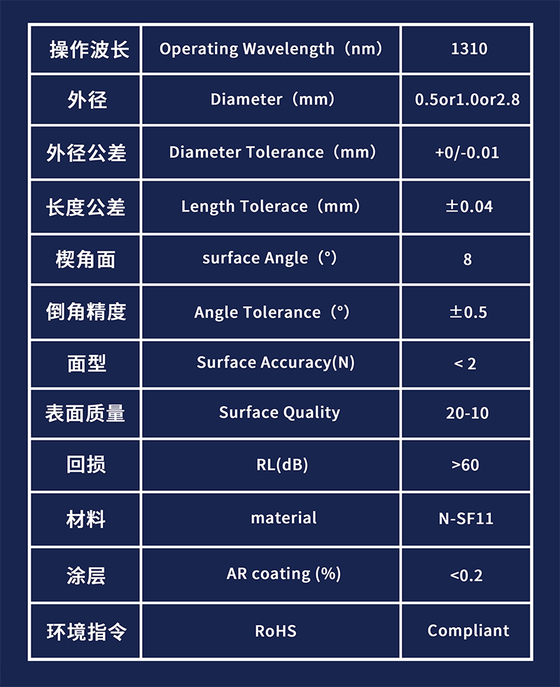 C-Lens用特殊材料设计,有着特殊的楔角面,专为准直器设计,用于光纤学。C-lens对高斯光束的准直效果良好,这种微型透镜可将单梭光纤传播为准直光束,插损较小;反过来 ,它也可用作藕合器将准直光束藕合到光纤里面。C-Lens可 为不同工作距离的准直器设计,尤其是长工作距离。